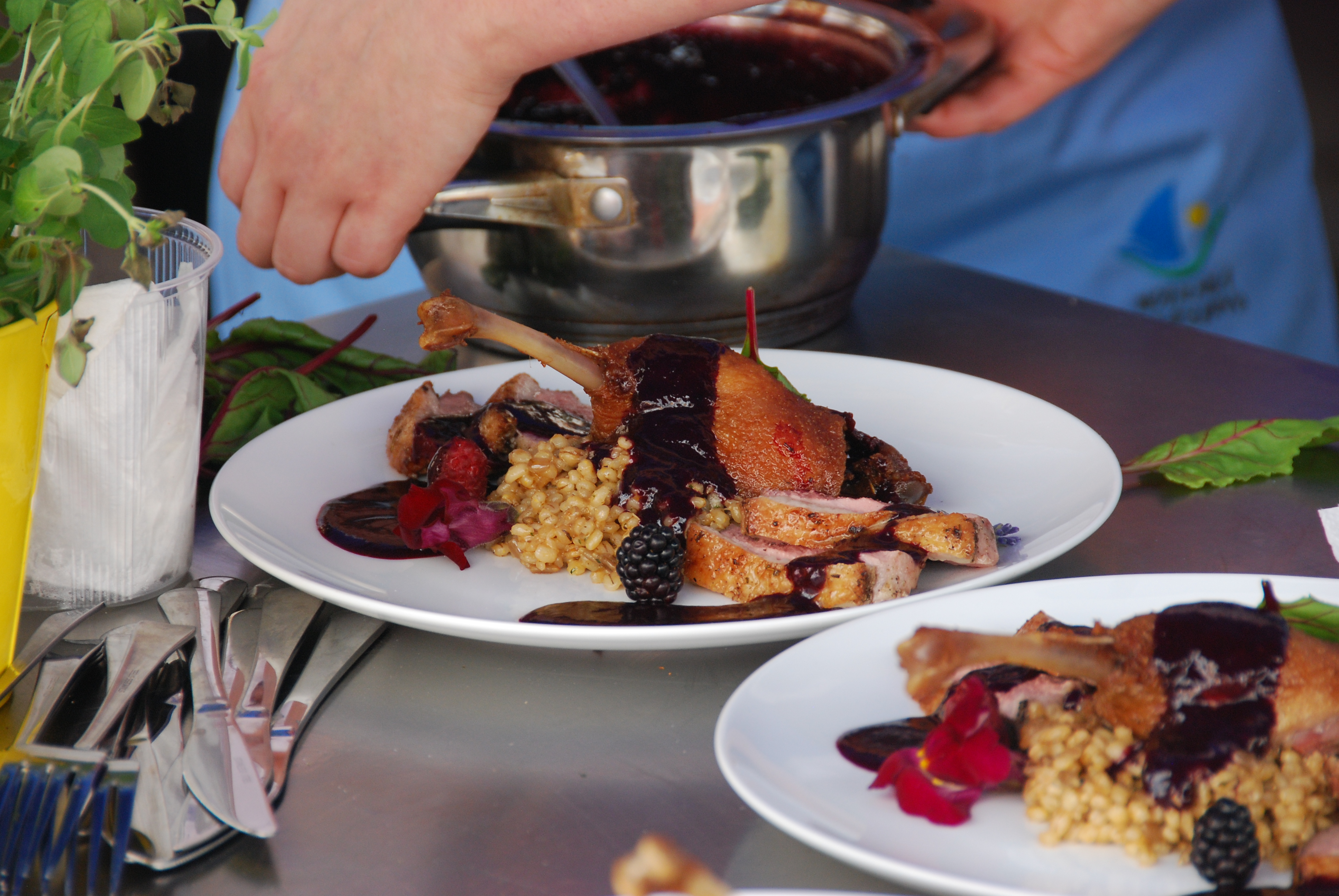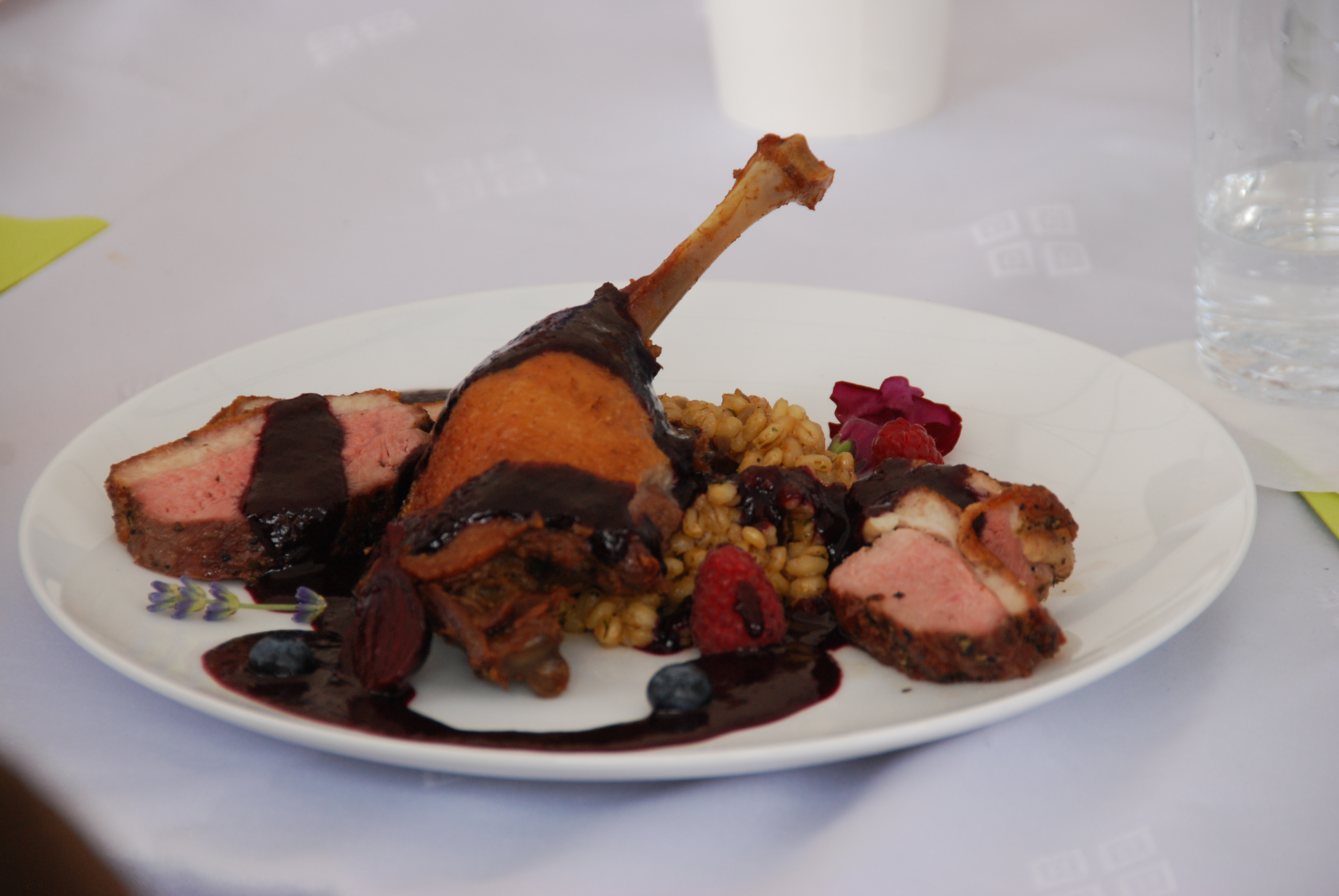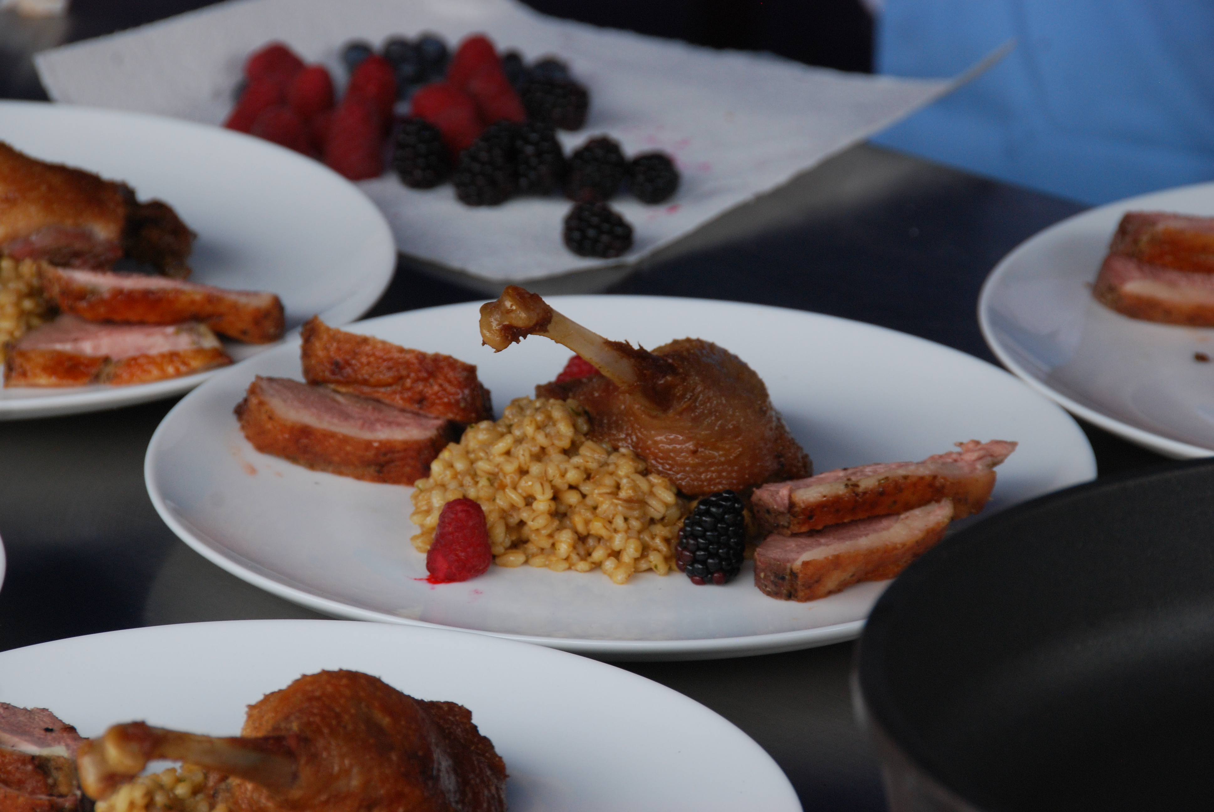 Piersi z kaczki smażyłysmy saute na patelni, po czym chwilę podpiekałysy w piecyku. Nogi z kaczki gotowałyśmy przez 2 godziny w gęsim tłuszczu. Do tego przygotowałyśmy sos na bazie owoców lesych (malin, jagód, jeżyn) na kaczym demi glasie, porto, nalewce malinowo-dereniowej z dodatkiem masła. Do tego pęczak z prażonymi pestkami słonecznika, ziołami i bulionem. Prawda, że pyszne? Jak się zbiorę w sobie napiszę Wam recepturę od A do Z 😉