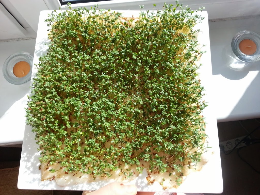 Z kawałkami pleśniowego sera i kiełkami świeżej rzeżuchy na wierzchu nabierze charakteru, a także zyska nieco ostrości. Ja swoją rzeżuchę wysiałam w ubiegłym tygodniu – zrobiła się z niej prawdziwa łąka: